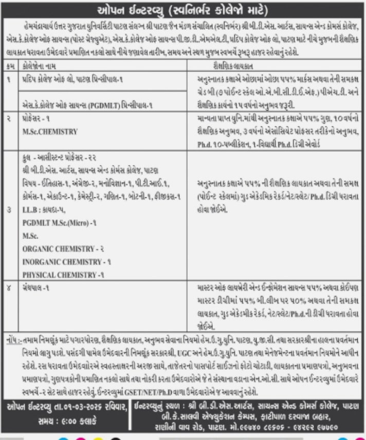 (Intro) Hemchandracharya North Gujarat University (HNGU), Patan se affiliated self-financed colleges mein teaching aur non-teaching staff ki bharti ka notification jaari ho gaya hai. Shri Patan Jain Mandal dwara sanchalit alag-alag colleges mein Principal, Professor, Assistant Professor, aur Librarian ki vacancies ke liye 01 March 2026 ko open interview rakha gaya hai.